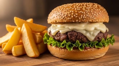 Sink your teeth into a juicy, flame-grilled burger layered with crisp lettuce, ripe tomato, and melted cheese, all nestled in a toasted bun. Paired with golden fries and a fresh garden salad, it’s the ultimate lunch trio: satisfying, flavorful, and perfectly balanced to fuel your afternoon with delicious energy.